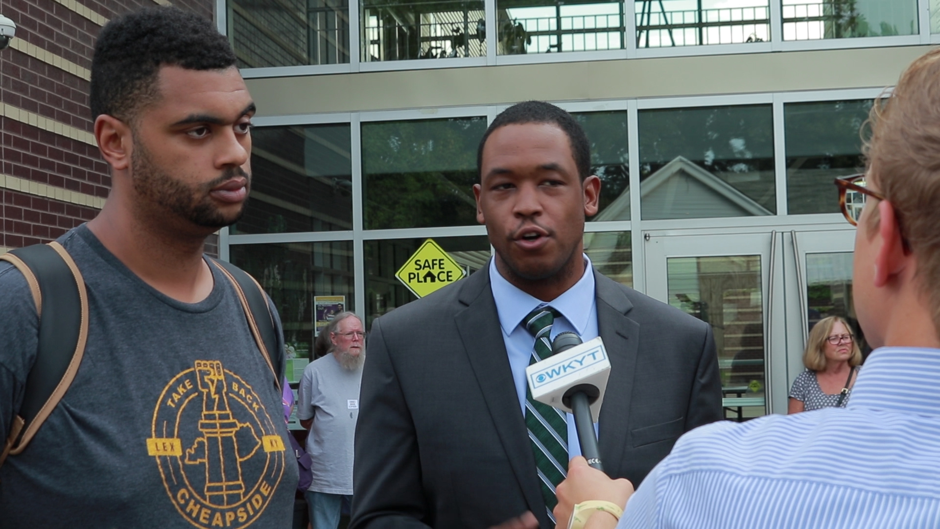 August 11, 2020 1920 × 1080 ROUGH CUT.00_16_27_16.Still007 Russell Allen (left) and DeBraun Thomas (right) speak with the local news about their organizing efforts